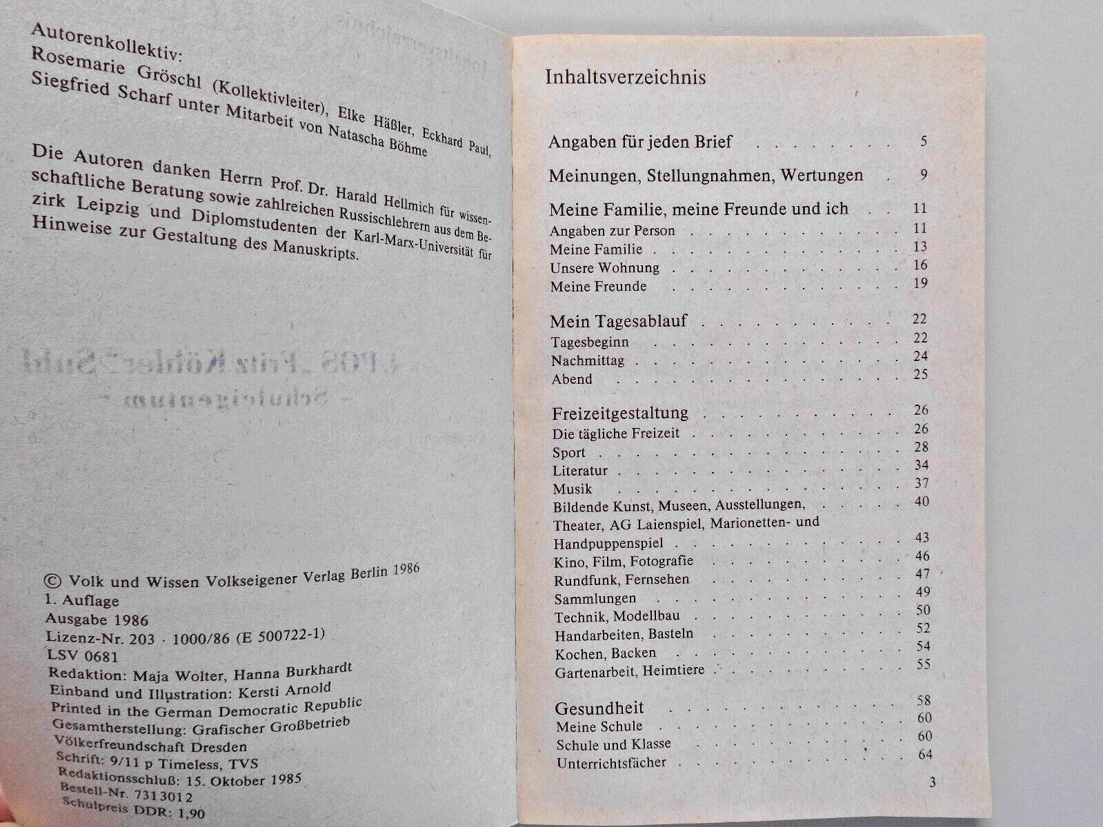 Dieses Buch war in der DDR ein beliebtes Hilfsmittel für den Schüleraustausch mit sowjetischen Partnerklassen. Es enthält zahlreiche authentische Musterbriefe, Redewendungen und Textbeispiele für den russisch-deutschen Briefwechsel.