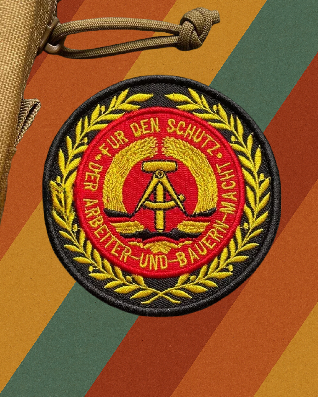 Dieser detailreiche DDR-Aufnäher mit dem originalen Emblem „Für den Schutz der Arbeiter- und Bauern-Macht“ ist ein echtes Symbol der Ost-Geschichte. Das runde Patch zeigt das Staatswappen der DDR, eingefasst von einem goldgelben Lorbeerkranz auf rotem Grund. Die hochwertige Stickerei macht das Abzeichen zu einem echten Hingucker auf Jacken, Westen, Taschen oder Sammelboards. Rückseitig mit Bügel- oder Klettoption erhältlich, je nach Variante. Ideal für Fans der DDR-Zeit, Sammler oder als Ostalgie-Geschenk.