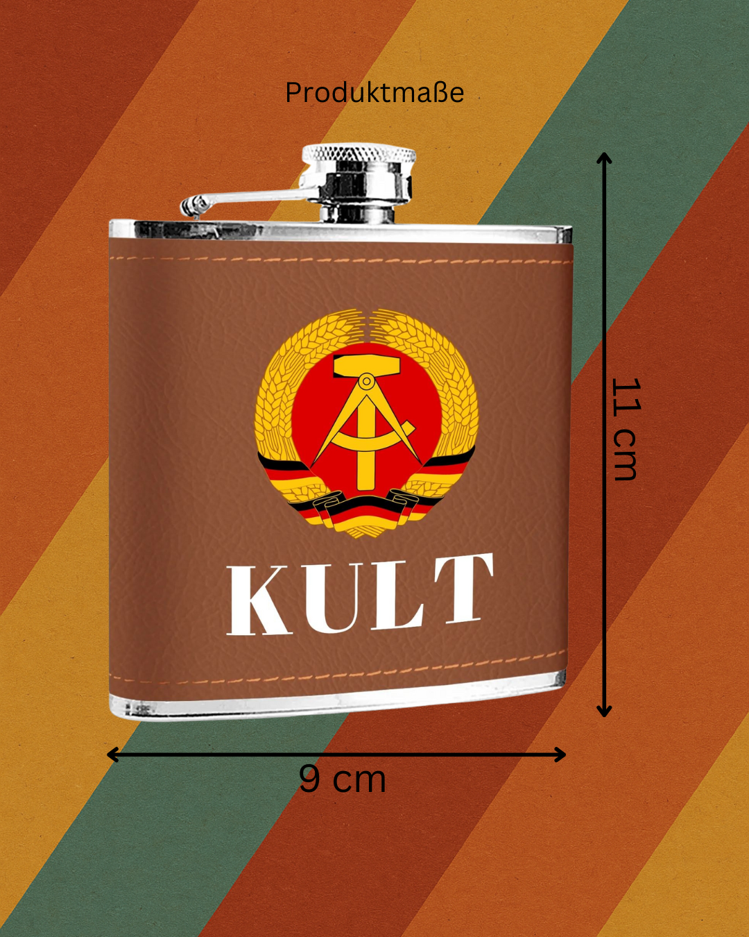 Er ist mit edlem, braunem Kunstleder bezogen, das nicht nur gut aussieht, sondern auch griffig in der Hand liegt. Genial: Der Schraubverschluss ist fest mit der Flasche verbunden – den verlierst du also auch nach dem dritten Schluck nicht im hohen Gras.