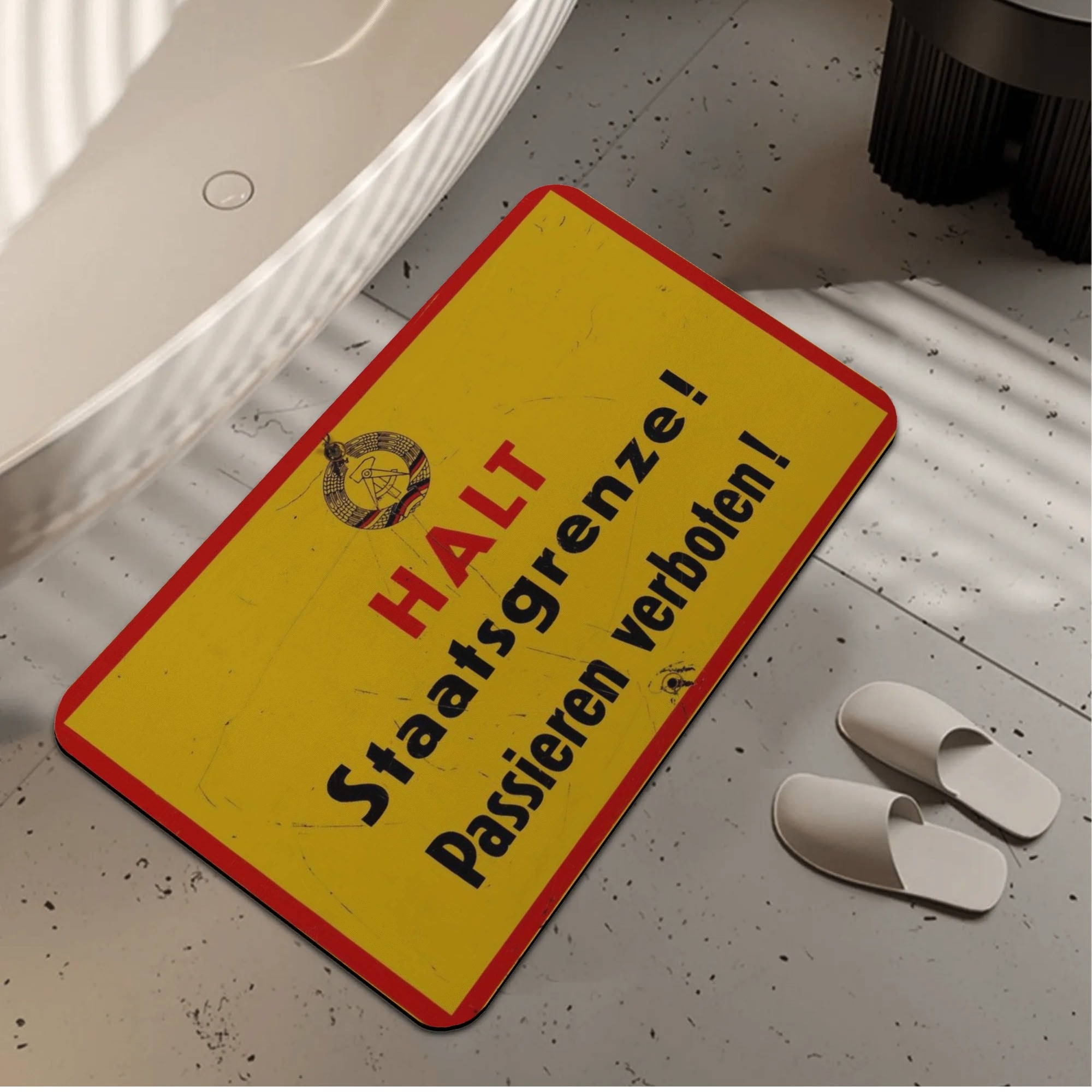 Das Design erinnert an das ikonische Grenzschild der DDR. Es verbindet Funktion mit Haltung – und bringt ein Stück DDR-Geschichte zurück in den Alltag. Egal ob morgens nach dem Duschen oder als kultiger Hingucker im Gäste-WC: Diese Matte ist Ostalgie pur.