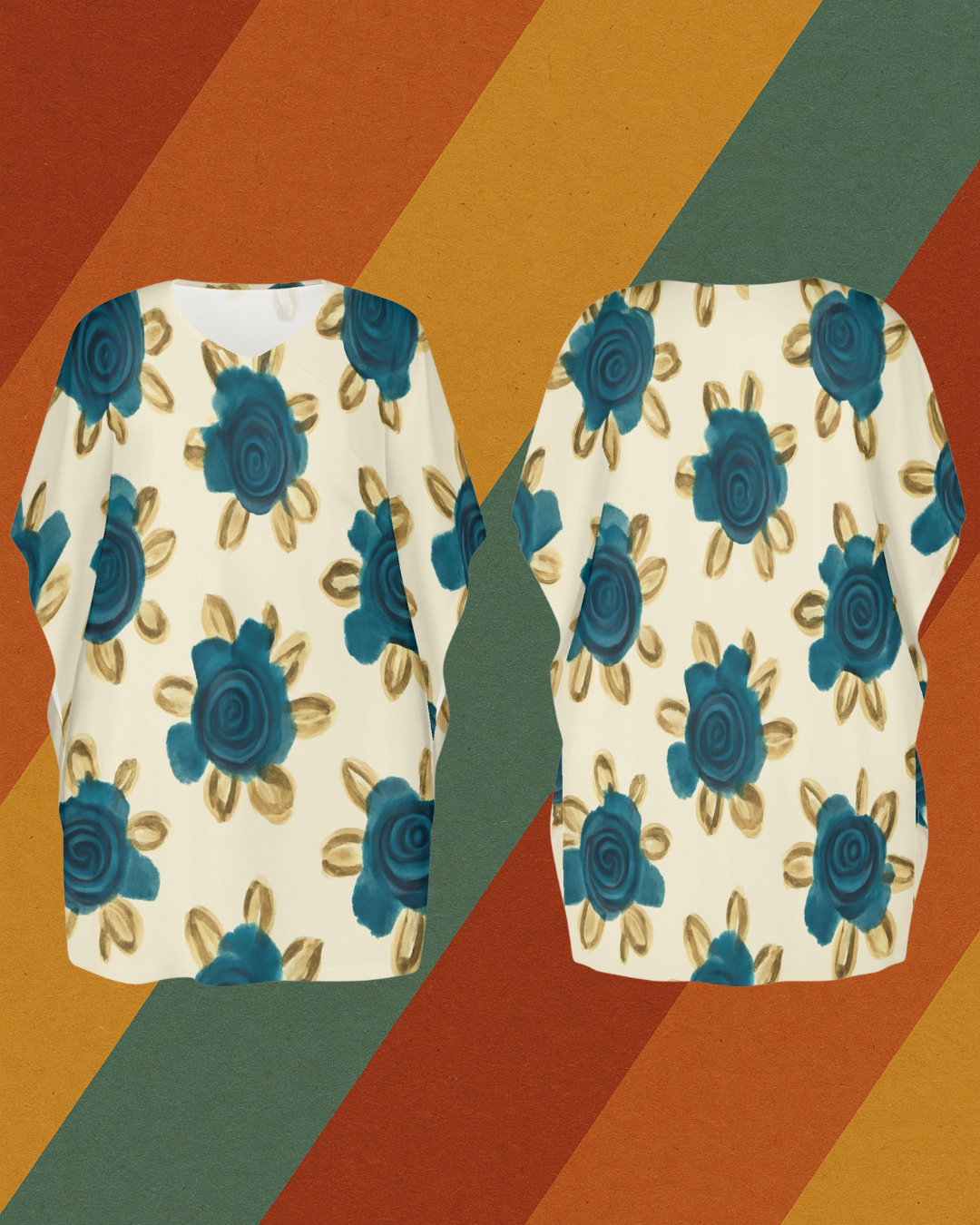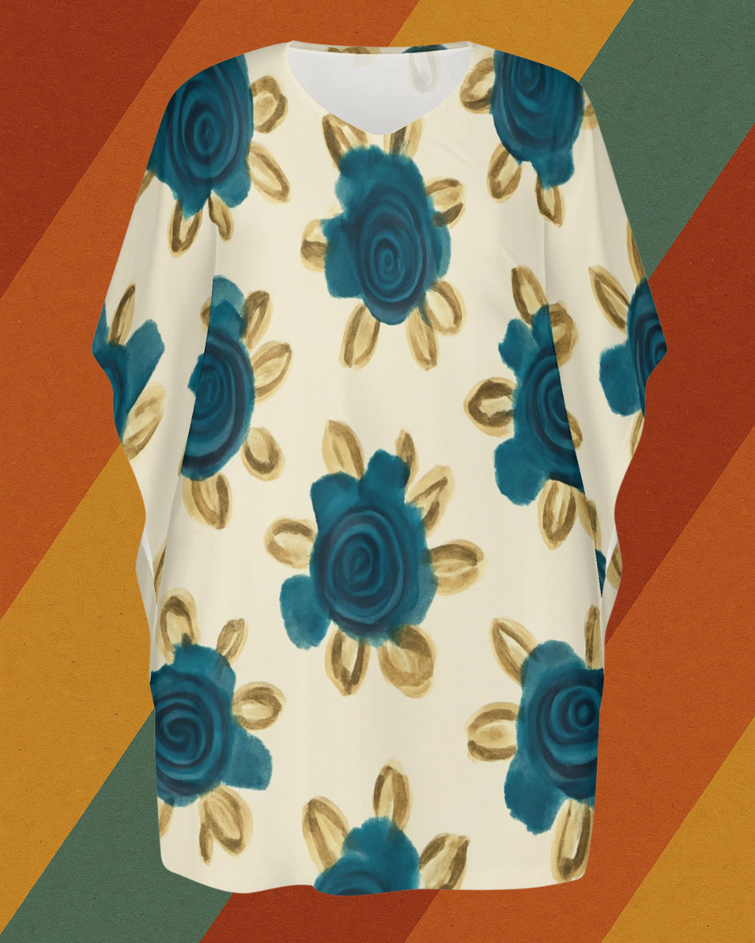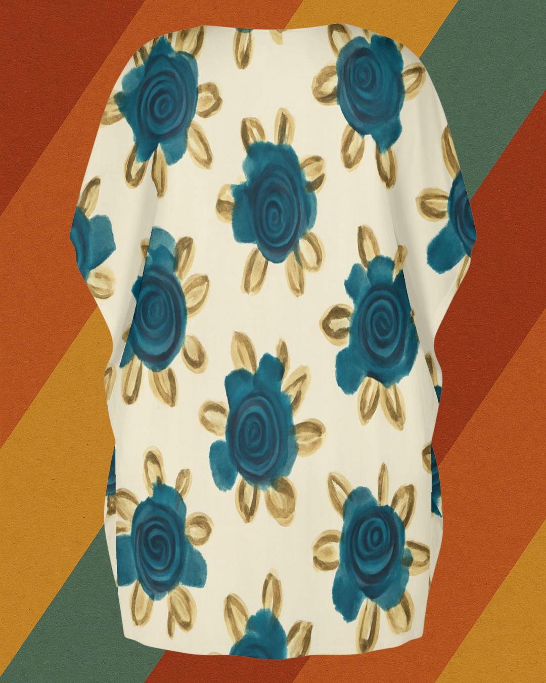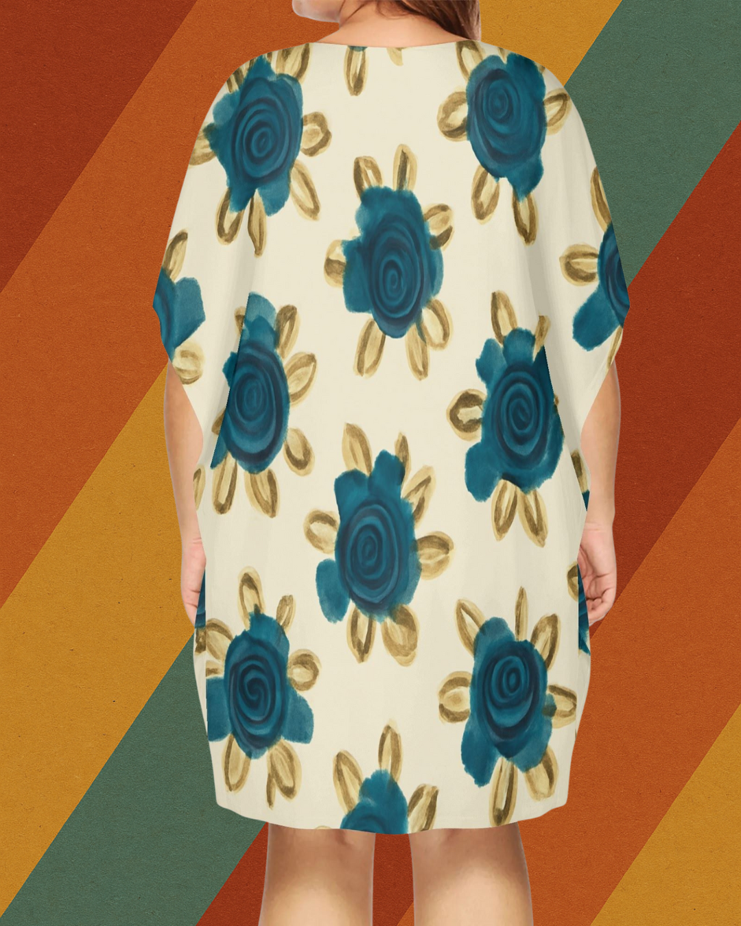 Dieses locker fallende Kleid mit blauen Blüten erinnert an die handgemalten Rosenmuster auf Omas Vorhängen, Tapeten oder ihrem liebsten Nachthemd. Ein DDR-inspiriertes Design, das Gemütlichkeit und Vintage-Flair vereint – ideal für Zuhause, Urlaub oder das nächste Gartenfest.