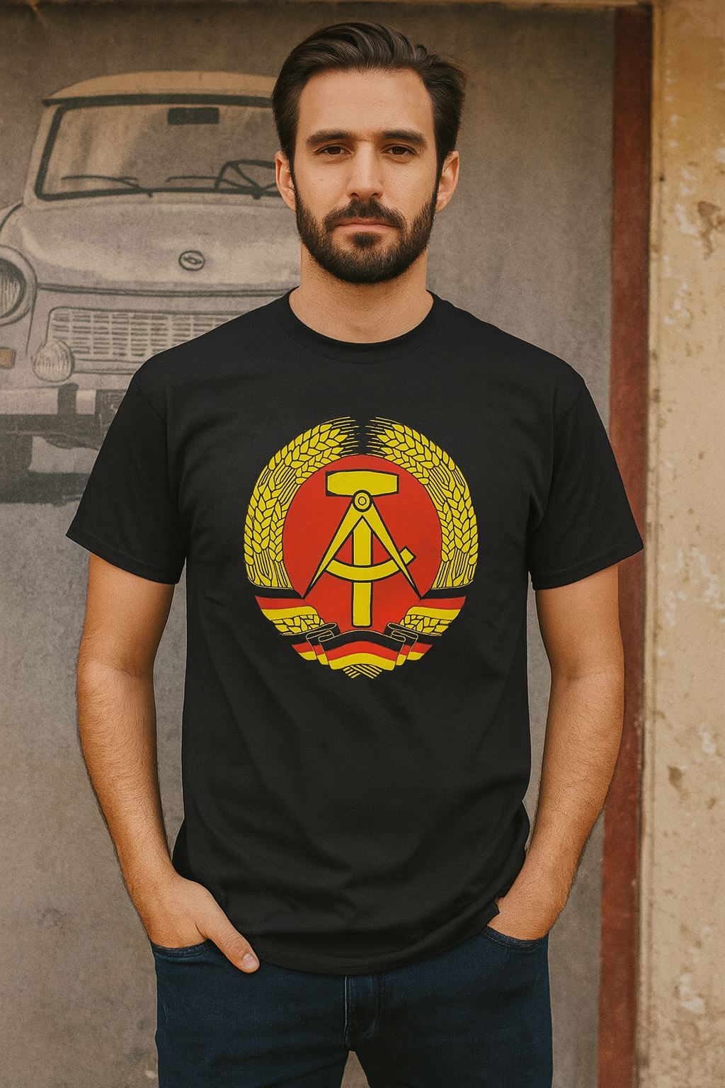 Dieses schwarze T-Shirt zeigt das legendäre Staatswappen der DDR in leuchtenden Farben – ein kraftvolles Symbol ostdeutscher Identität. Der klassische Druck mit Hammer, Zirkel und Ährenkranz steht für Arbeit, Wissen und Solidarität. Ob als Statement auf dem Festival, im Alltag oder als Geschenk für echte Ostkinder – dieses Shirt bringt Geschichte auf die Brust und Haltung in den Alltag.