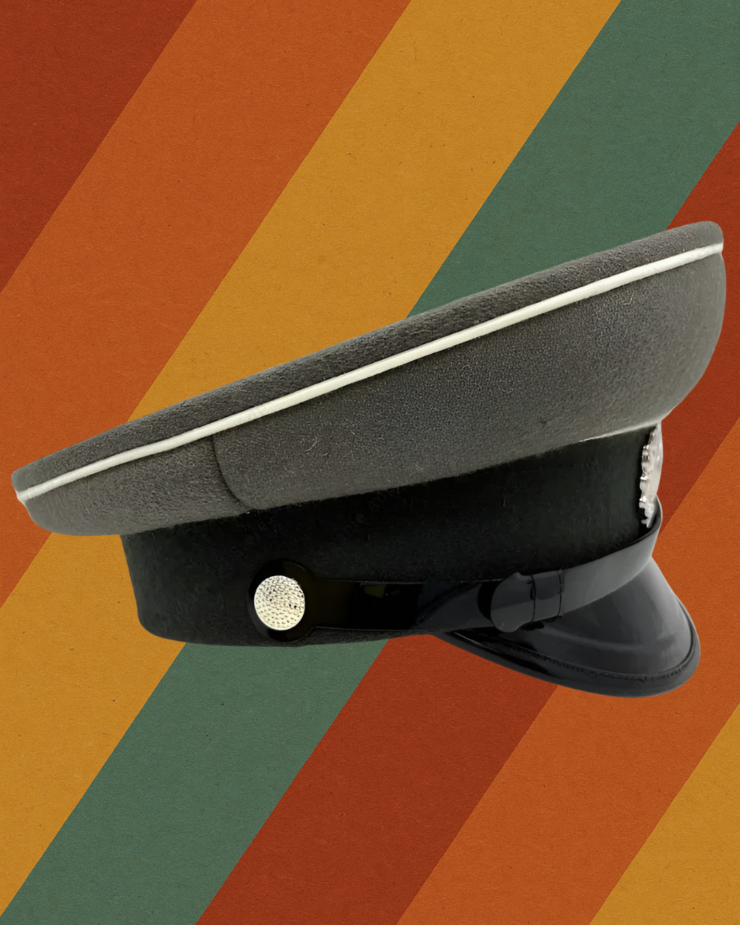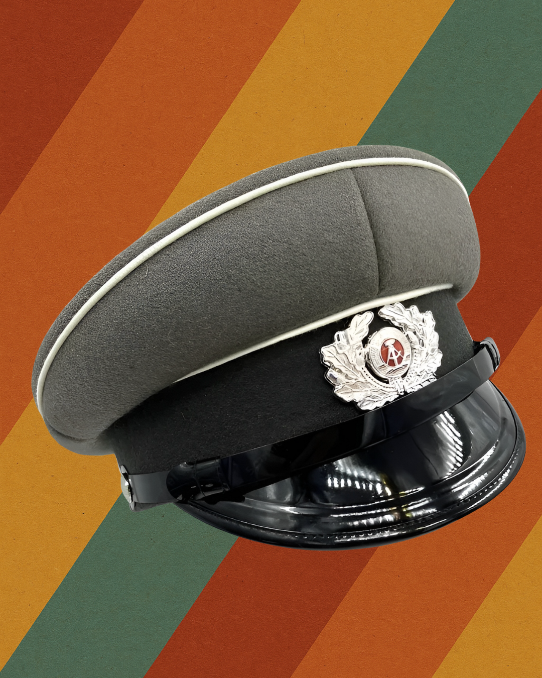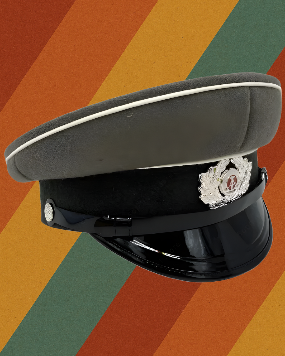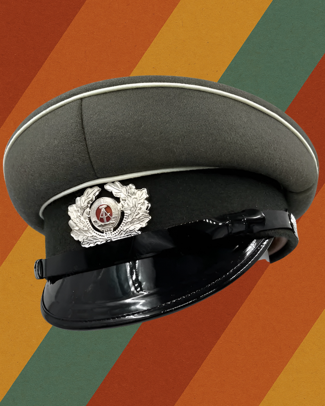 Graugrüner Stoff, schwarzer Kunststoffschirm, silberne Knöpfe und die markante Kokarde machen diese Mütze zu einem typischen Vertreter der DDR-Uniformkultur. Ob als Sammlerstück, für Reenactment, Theater oder als Ostalgie-Accessoire – diese Schirmmütze bringt DDR-Atmosphäre ins Heute.