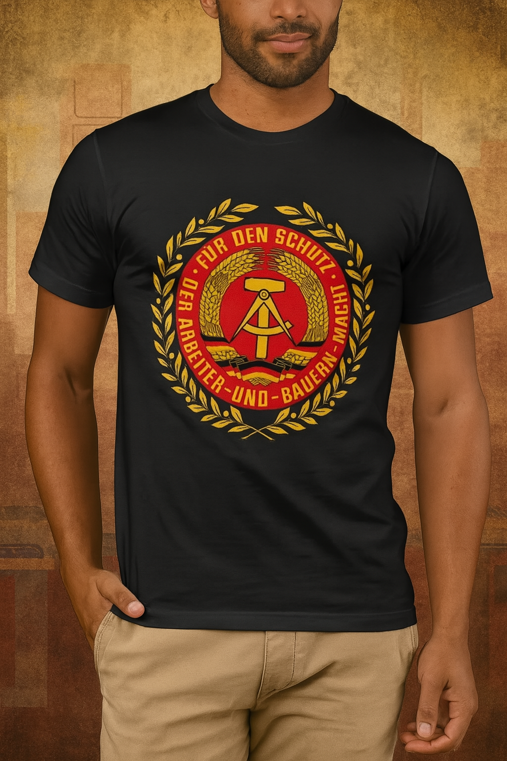 Ein Symbol der Geschichte auf Stoff gedruckt. Dieses T-Shirt zeigt das DDR-Staatswappen in voller Pracht, umrahmt von der Losung der Nationalen Volksarmee. Es ist mehr als ein Kleidungsstück. Es ist ein Statement für Herkunft, Haltung und die Erinnerung an eine Zeit, die Menschen geprägt hat. Das kräftige Rot-Gelb auf tiefschwarzem Grund sorgt für maximale Wirkung.