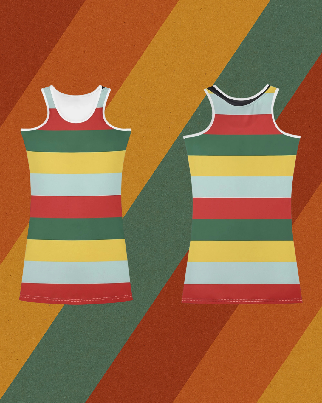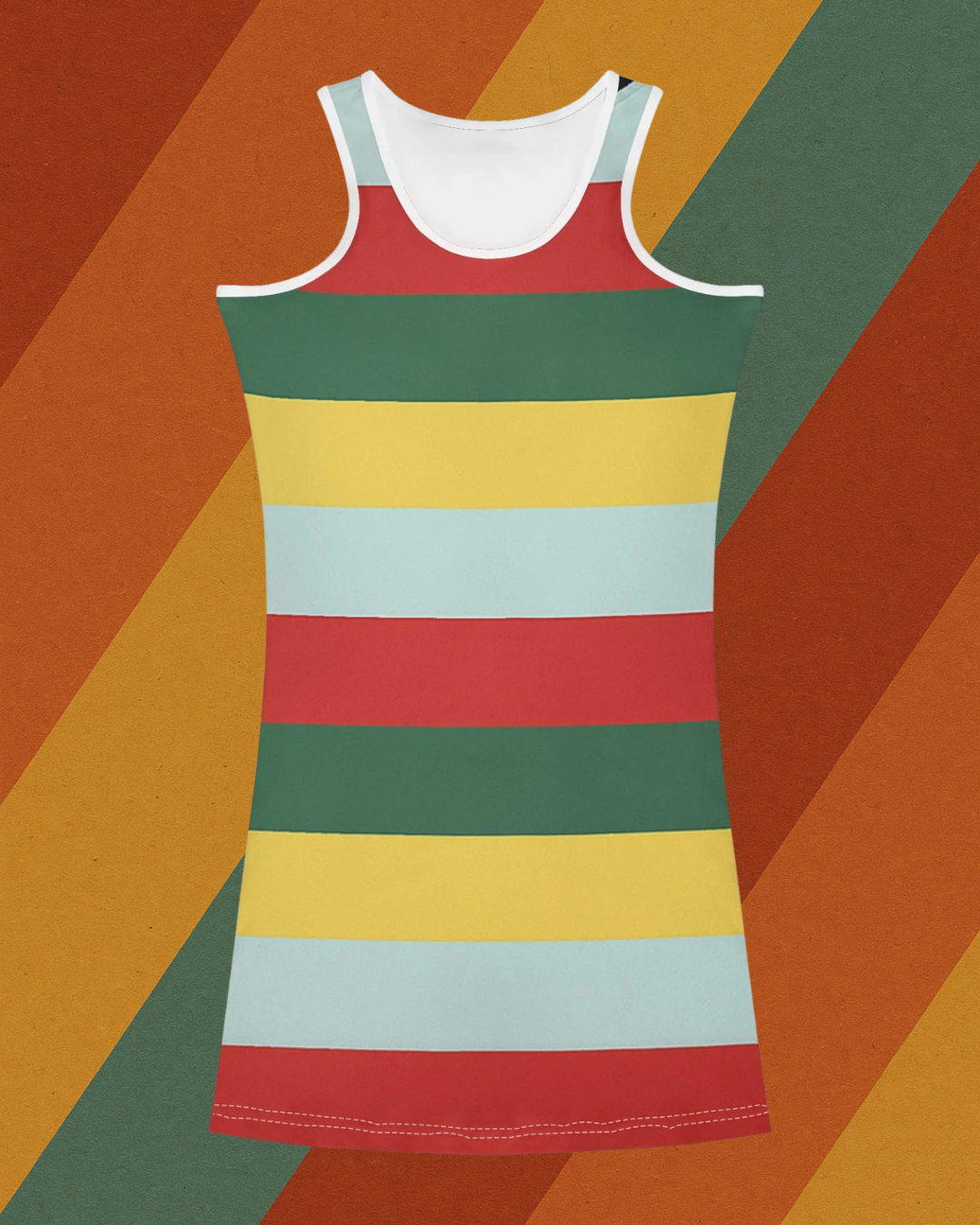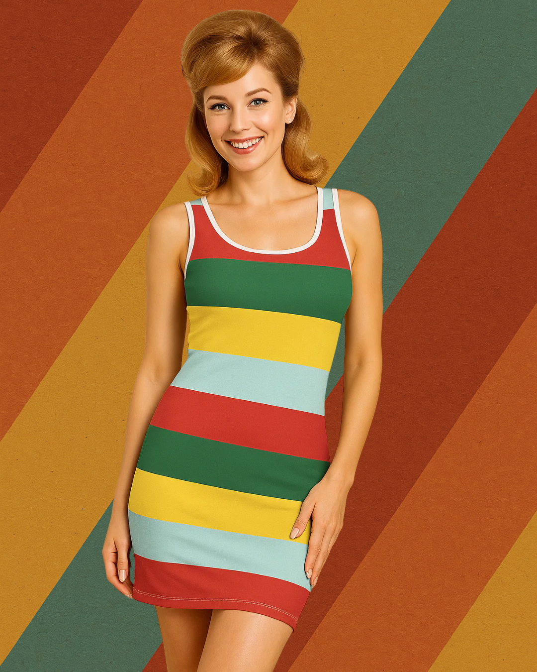 Ein Sommerkleid wie aus einer alten Ost-Werbung – nur besser. Dieses gestreifte Minikleid verbindet moderne Passform mit einem Hauch von Volkseigener Mode. Die breiten Farbstreifen in Retro-Farbkombination erinnern an Freibadtage, Dederon-Tischdecken und eine Portion Lebensfreude.