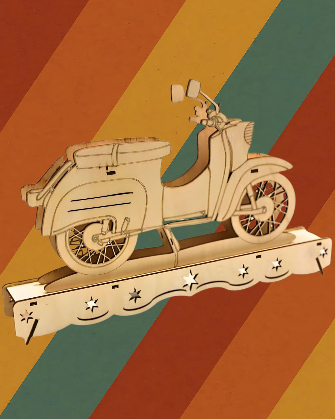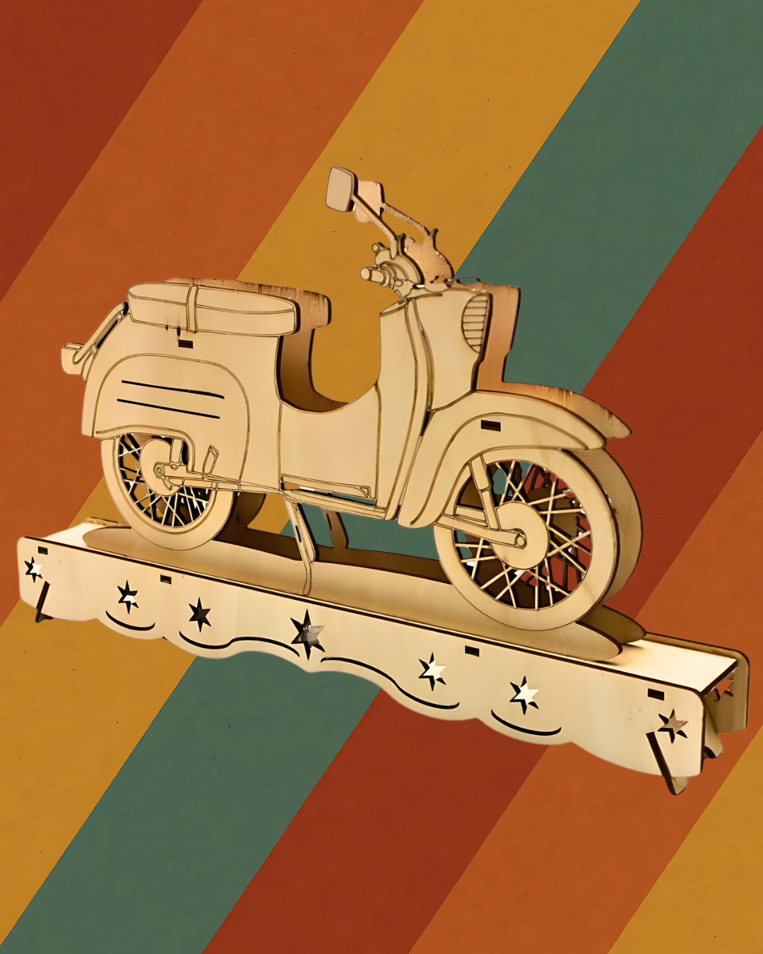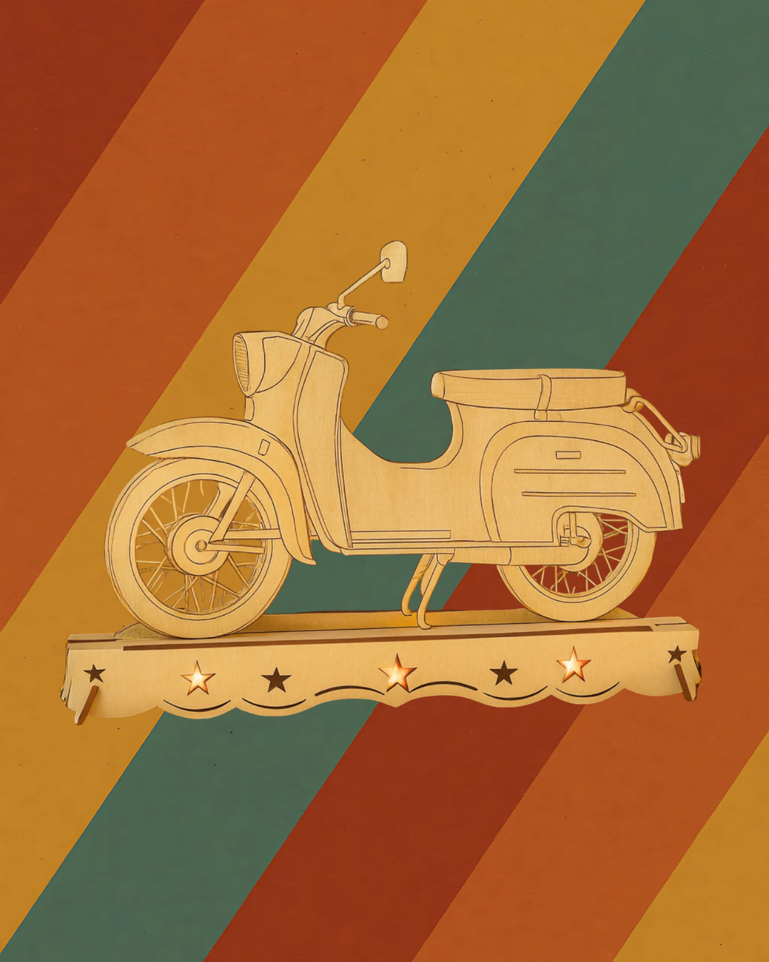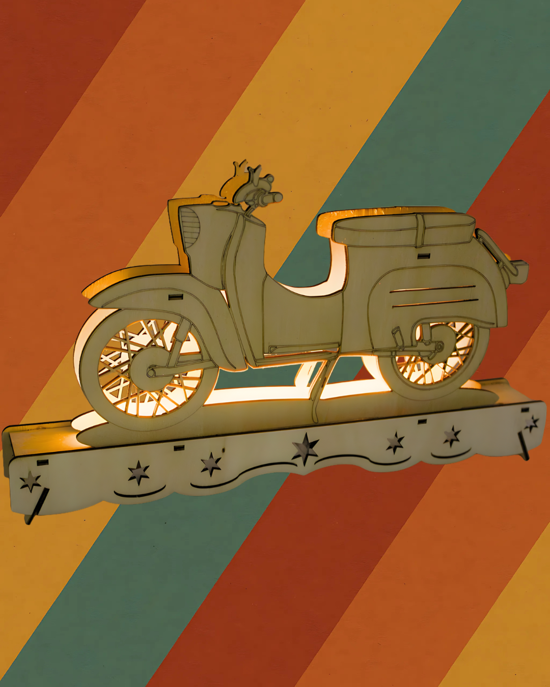 Bringen Sie nostalgisches Flair in Ihr Zuhause mit dem Ostalgie Schwibbogen. Der detailreich gestaltete Holzschwibbogen zeigt das ikonische DDR-Moped in präziser Laseroptik und erinnert an vergangene Zeiten sowie an die Kultur der DDR. Die batteriebetriebene LED-Beleuchtung sorgt für warmes, stimmungsvolles Licht ganz ohne störende Kabel. Ideal für Fensterbänke, Regale oder den festlich geschmückten Adventstisch.